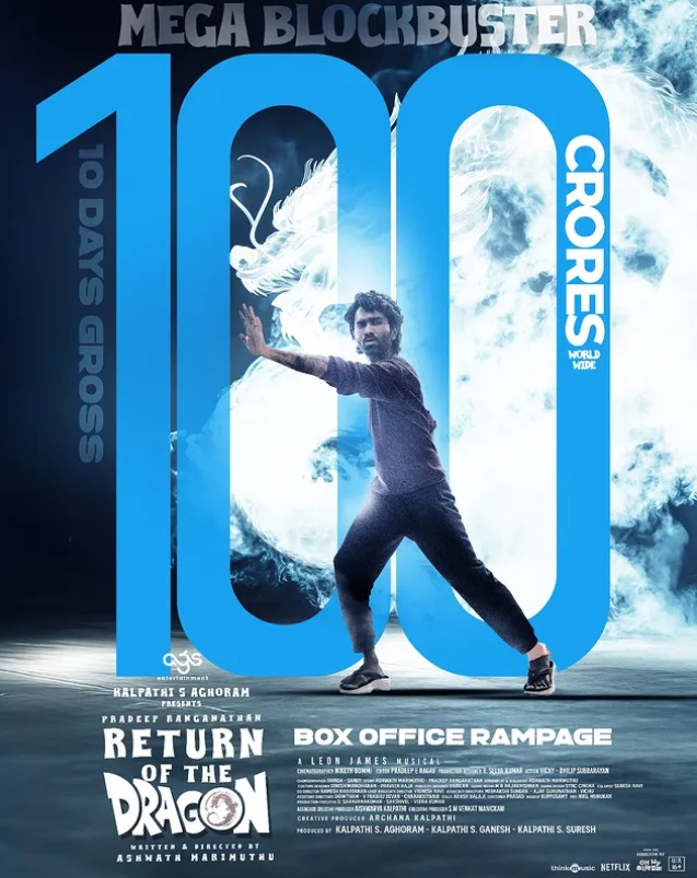Directed by Ashwath Marimuthu, Dragon in Tamil (released as Return of the Dragon in Telugu) has become a massive success, crossing the 100 crore mark within 10 days of its theatrical release. The film, a coming-of-age comedy-drama about a college student, has pulled a significant youth audience to theaters.