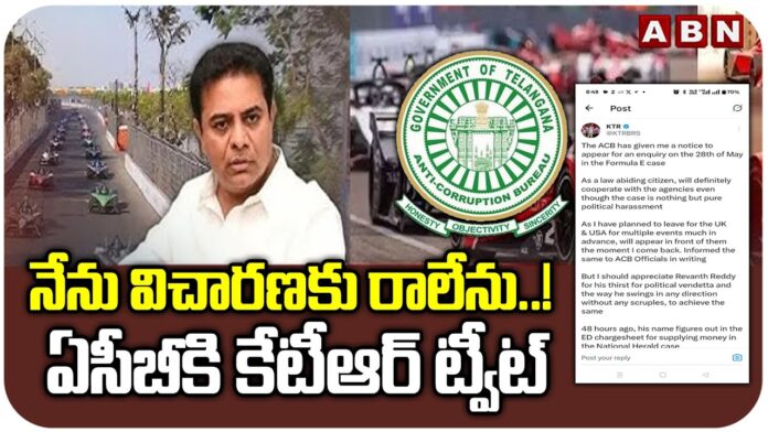 HomeVideo News KTR Responds to ACB Notice in Formula E Case via Tweet Wednesday, December 17, 2025 By awposter Share FacebookTwitterPinterestWhatsApp Tags: #BRS, #KTR, #Telangana Tags#ACBNotice#BRS#FormulaECase#KTR#Telangana#TelanganaPolitics Share FacebookTwitterPinterestWhatsApp Previous articleKTR Responds To ACB Notice In Formula E CaseNext articleVijay Deverakonda Drops Fun ‘Kingdom Boys Meet’ Video Related Articles Movie News Baahubali-The Epic sets a new benchmark in Re-release Movie News Meenakshi Chaudhary’s NC24 first look delayed Movie News Suriya’s Karuppu targets Republic Day weekend? !!!!!!!! Hiring content writers !!!!!!!!!Contact us : [email protected] Latest Articles Movie News Baahubali-The Epic sets a new benchmark in Re-release Movie News Meenakshi Chaudhary’s NC24 first look delayed Movie News Suriya’s Karuppu targets Republic Day weekend? Movie News Lokah Chapter 1 finally arrives on OTT Movie News Suriya to collaborate with another Telugu director? Movie News This B’Town actress roped in for Lokesh Kanagaraj’s next Movie News Latest update on Ram Charan’s Peddi Movie News Kantara: BMS reveals the total tickets sold ahead of OTT Movie News Aaryan Telugu release has been delayed by a week Movie News Buzz: Ravi Teja’s multi-starrer with this young hero Load more
