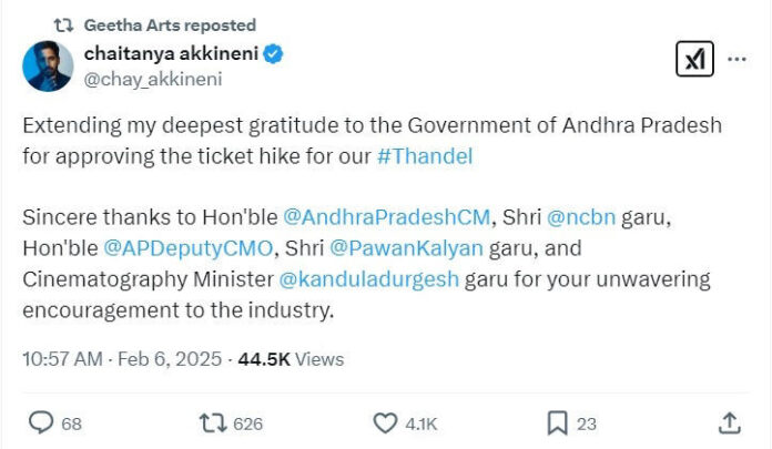 అయితే ఈ సినిమా మేకర్స్ ఇపుడు ఏపీ ముఖ్యమంత్రి చంద్రబాబు నాయుడు అలాగే ఉప ముఖ్యమంత్రి, తెలుగు సినిమా స్టార్ హీరో పవర్ స్టార్ పవన్ కళ్యాణ్ లకి ప్రత్యేక ధన్యవాదాలు తెలియజేశారు. ఏపీలో తండేల్ సినిమాకి అదనపు ధరలు పర్మిషన్ ఇచ్చినందుకు గాను వారితో పాటుగా ఏపీ సినిమాటోగ్రఫీ శాఖ మంత్రి కందుల దుర్గేష్ కి కూడా గీతా ఆర్ట్స్ సంస్థ కృతజ్ఞతలు తెలియజేశారు. ఇక ఈ చిత్రానికి దేవిశ్రీప్రసాద్ సంగీతం అందించారు.